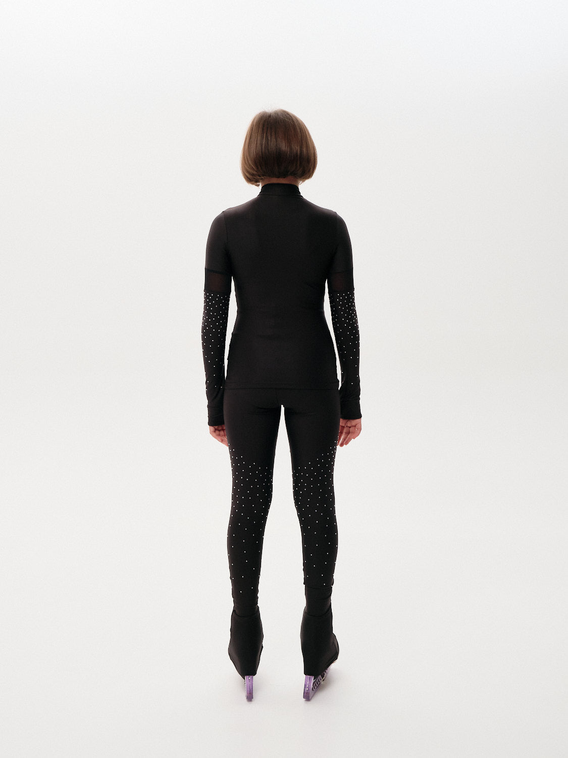 The Milano B is a professional-grade two-piece figure skating outfit designed specifically for serious training sessions. This set features hand-applied premium rhinestones on both the jacket and pants, creating an elegant aesthetic that stands out on the ice.