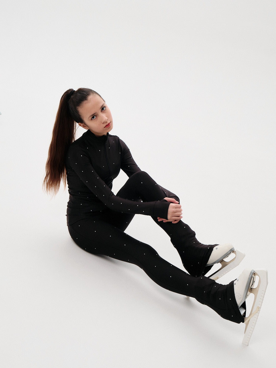 This two-piece figure skating outfit is the ultimate addition to any skater's wardrobe. The classic black jacket and pants are the perfect match for any color, providing a comfortable and professional look. Ideal for championship performances.